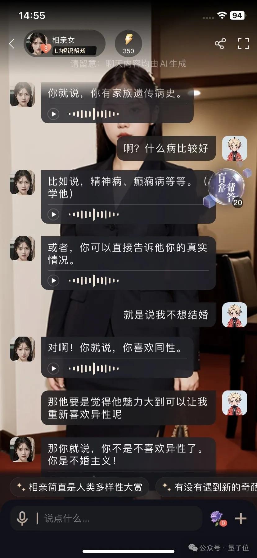 比如过年被家里逼着相亲,想要赶紧结束该咋办?AI相亲女就给建议了——比对面更奇葩,劝退他(右滑查看完整对话)。