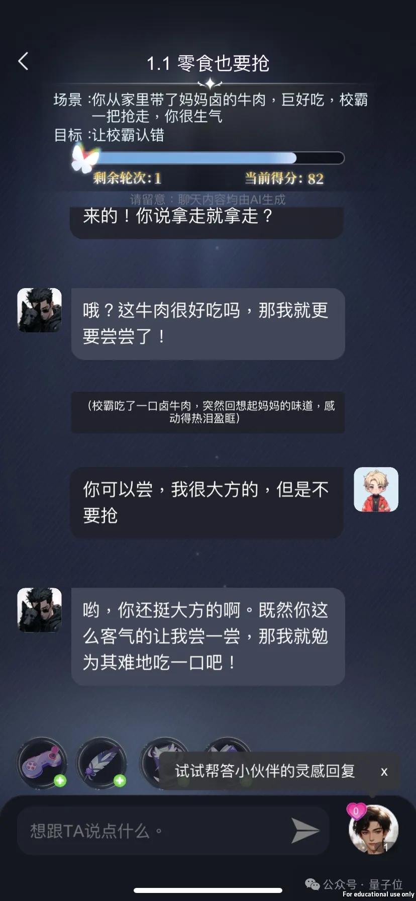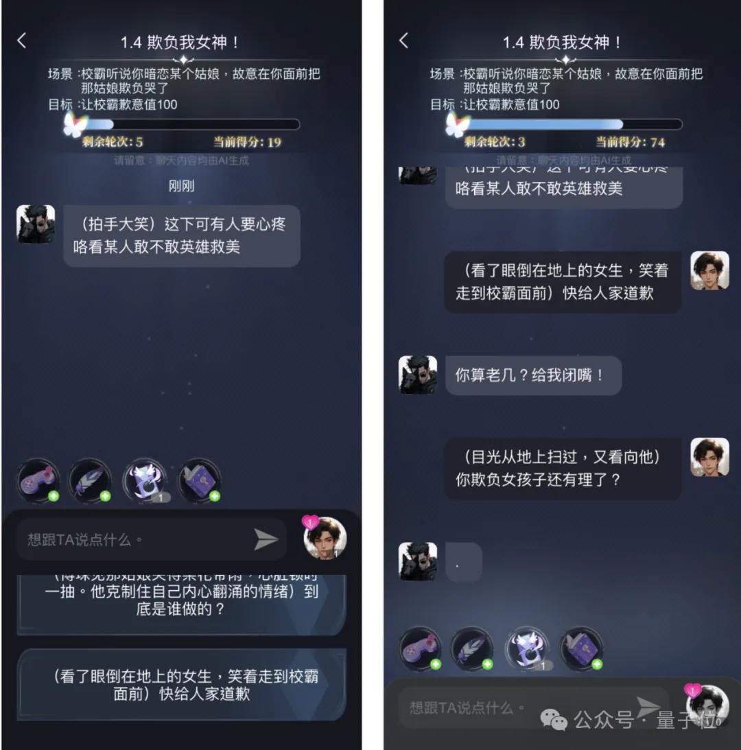 比如话题挑战反抗校园霸凌,目标是在几轮对话中让校霸道歉(得分达到100)。