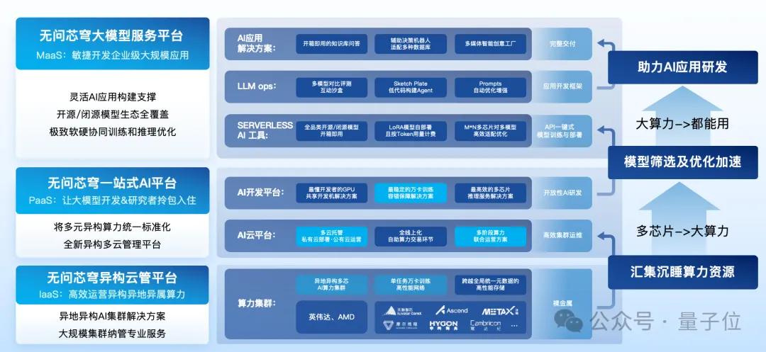 首先在最底层激活各种多元异构算力,面对中国特色的市场环境,将国产芯片及国内不同小算力集群进行标准化统一。