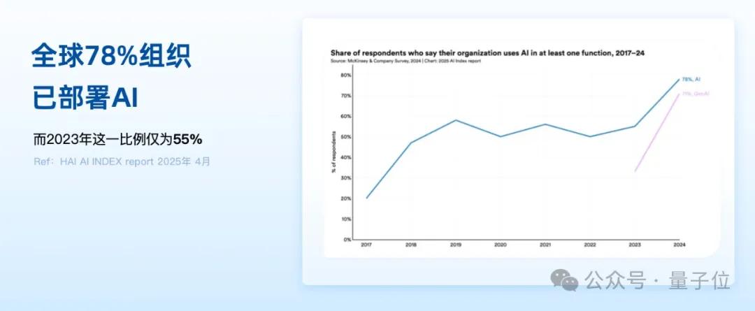 首先从全球来看,2024年李飞飞教授的一份report中有一个统计,在2023—2024年这一年里面,全球生成式AI部署热度达到非常高的增长态势,在一年时间里,从2023年55%的状态快速增长到78%,将近五分之四的企业组织表示已部分将AI能力部署到自己的组织中。