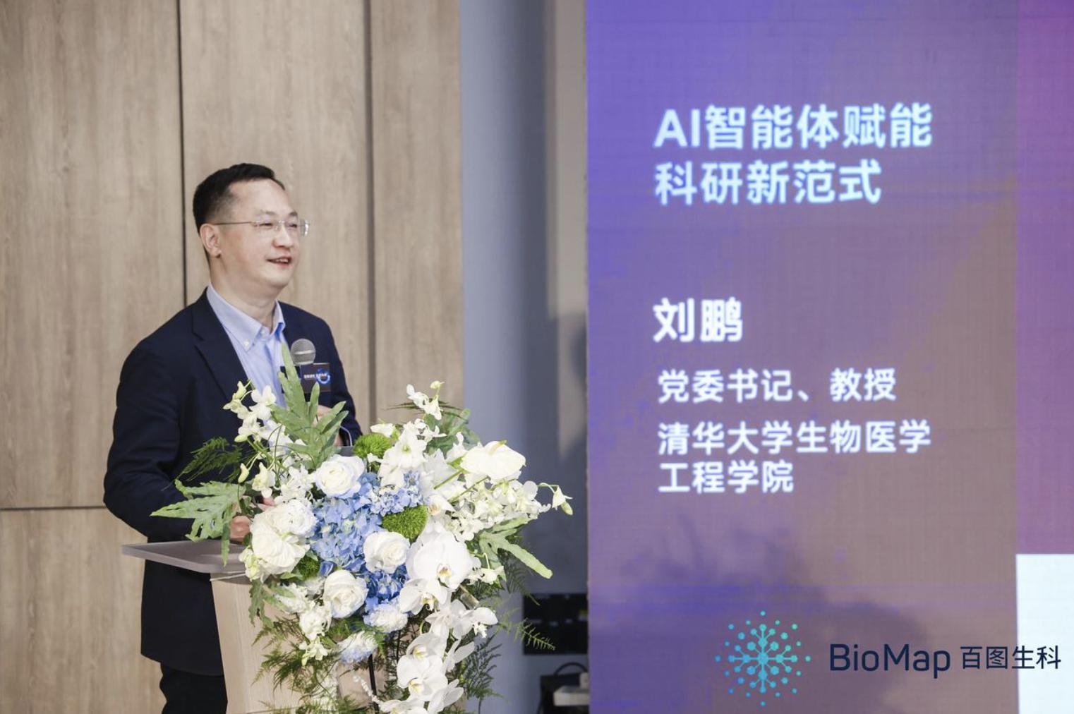 清华大学生物医学工程学院党委书记、教授刘鹏介绍了在教学与科研过程中应用AI智能体的前沿探索,并分享了与百图生科的战略合作进展。