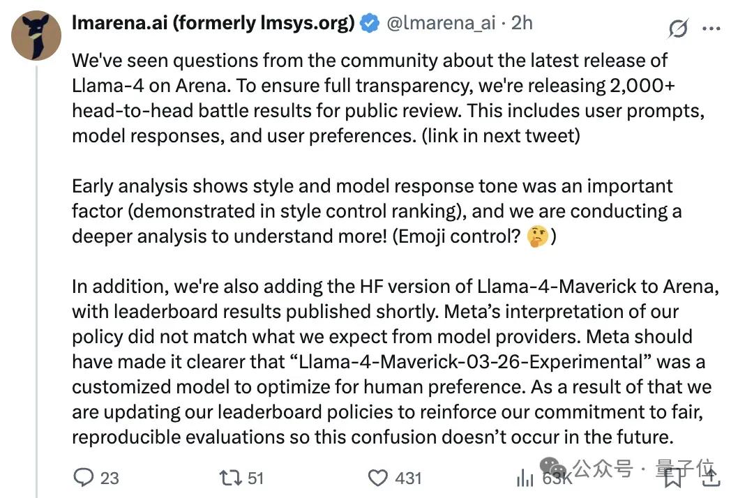 对于最新质疑,大模型竞技场官方Lmrena.ai已经给出回应: