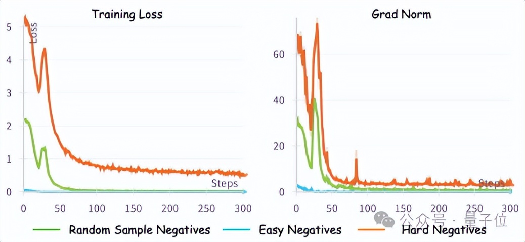 在下图中,展示了三种类型负样本的训练损失和裁剪前梯度范数:简单负样本(批次中最不相似的样本),随机负样本(批次中随机采样的负样本),以及困难负样本(在移除正例和假负例后批次中最相似的负样本)。