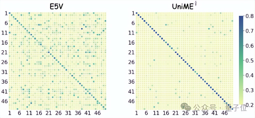 与E5-V相比,UniME矩阵的对角线清晰度显著增强,表明UniME学习到了更具判别性的表征。