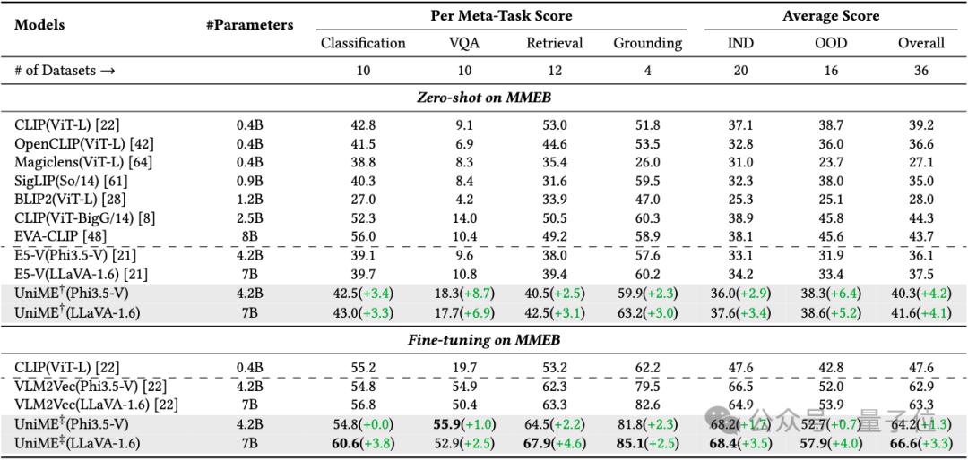 团队评估了MMEB中的分布内(20个测试集)和分布外(16个测试集)基准,以评估UniME在多样化检索任务中的多模态嵌入能力。
