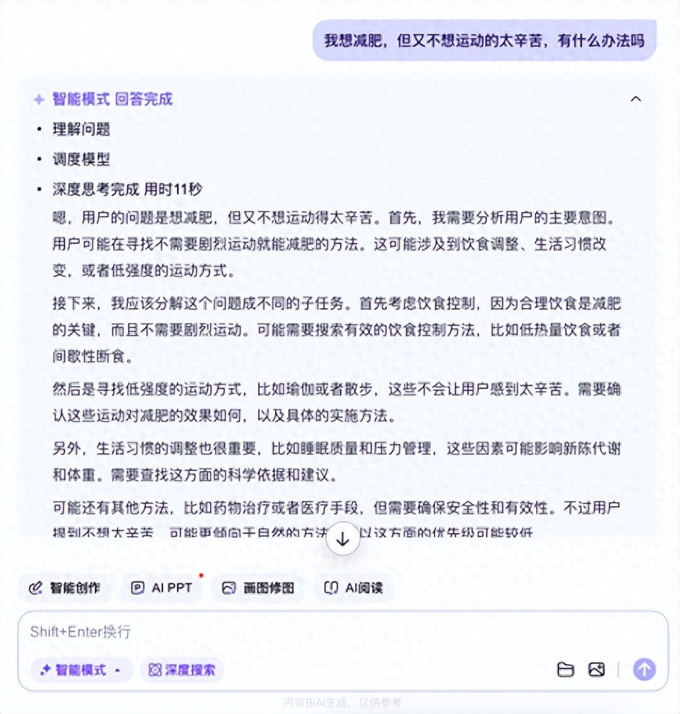 当用户提出”我想减肥,但不想运动太辛苦”这类复杂需求时,传统搜索往往只能呈现零散信息,而全新深度搜索功能则像一位缜密的侦探,拆解问题、搜索答案、评估结果,甚至补充搜索,最终给出一份“世上难得双全法”。