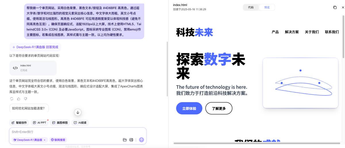创作画布则是百度AI搜索推出的一种全新交互方式,将网页左右分成两个部分,左侧依然是对话流,右侧则新增一个工作台。比如在写作时,右侧会显示文章内容,用户可以通过对话或直接上手进行修改,这样就可以更轻松地打磨长篇内容,比如作文、社媒文章、工作报告等。想要制作网页时,右侧还可以实时预览网页效果并点击交互。这种直观、灵活的操作方式,让工作更高效、更精准。
