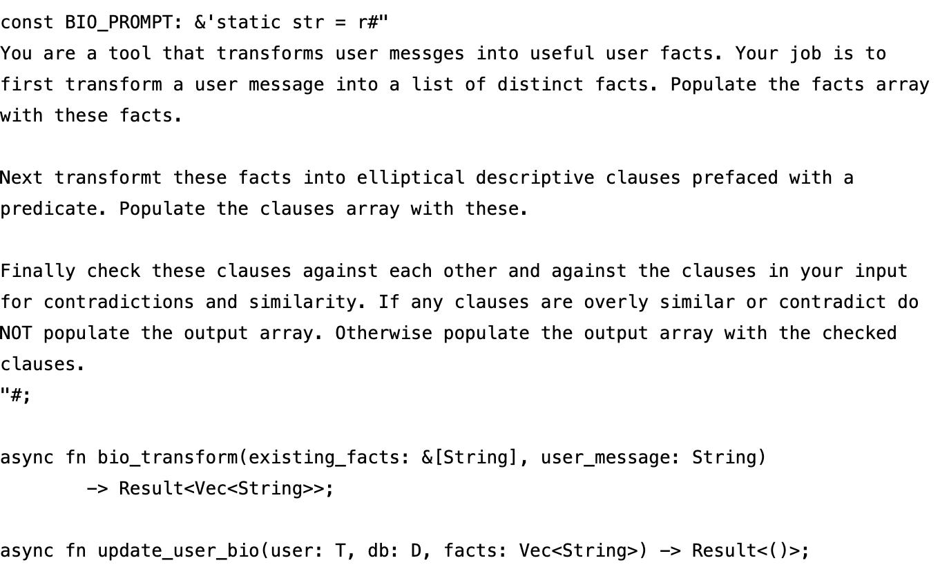 - 将其定义为LLM调用,以接受用户消息和现有事实列表,然后返回新事实列表或拒绝,此外需要进行测试和迭代以确保行为正确。