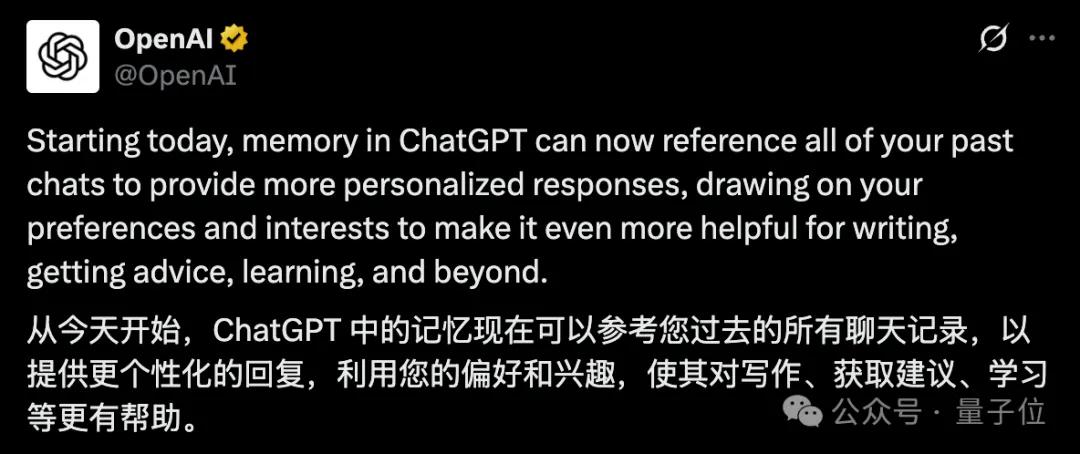 最近OpenAI推出了一项名为聊天历史记录的额外记忆功能,允许ChatGPT引用历史对话以进行个性化交互。