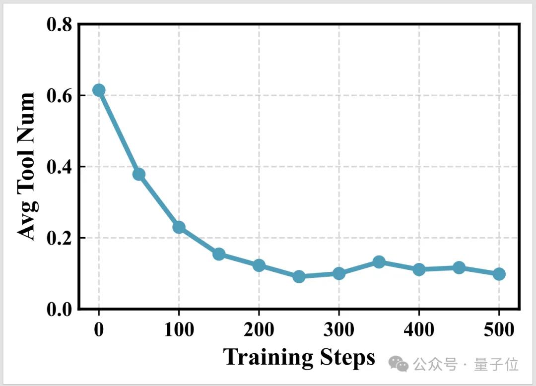 具体而言,随着训练的进行,模型平均调用的工具次数显著下降,说明它学会了“好钢用在刀刃上”,只在必要时才使用工具。