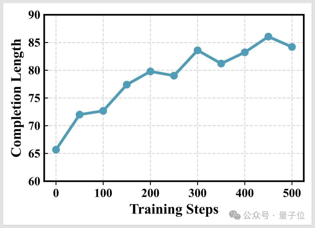 而且模型生成的答案(包括思考过程)长度增加了,表明它能够进行更详细、更深入的推理。