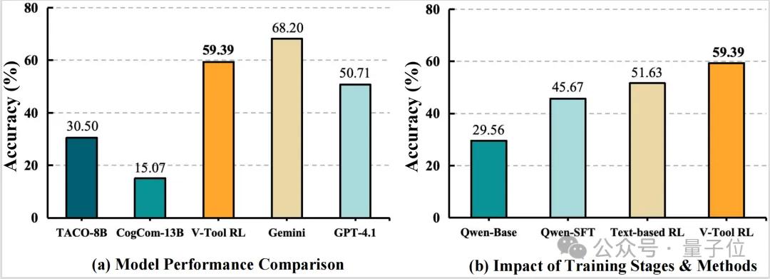 3、媲美顶尖模型:V-ToolRL的表现超过GPT-4.1,同时和Gemini达到持平的效果。
