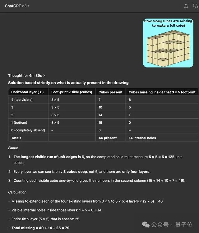 o3将最终组成的大立方体的规格理解为5x5x5,但它对于缺失的小立方体的数目仍旧给出了错误答案,用人类视觉来看,要形成5x5x5的大立方体需要125个小立方体,而图中已经给出了46个,所以答案应该为79。