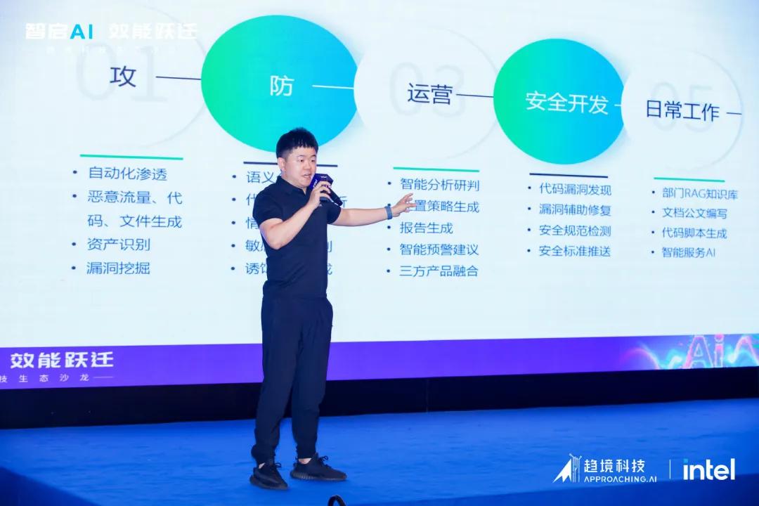 长亭科技联合创始人&副总裁龚杰则分享了 AI 在网络安全攻防的应用实践,长亭科技从攻-防-运营-安全开发-日常工作的全应用场景接入安全大模型,在自动化漏洞挖掘、智能化攻击手段、优化攻击策略、威胁情报分析、自动化安全监测、智能安全策略方面进行了实践探索。长亭科技与趋境科技合作实现千亿问津大模型私有化部署,全方位提升安全能力。