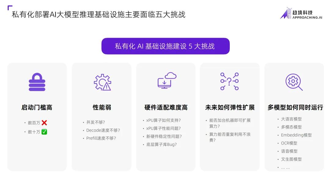 趋境科技CEO艾智远在演讲中提出当前的私有化AI基础设施建设的5大挑战:“大模型私有化部署面临启动门槛高、模型运行性能不够、硬件适配难、未来弹性扩展难、多模型调度复杂等五大挑战。”