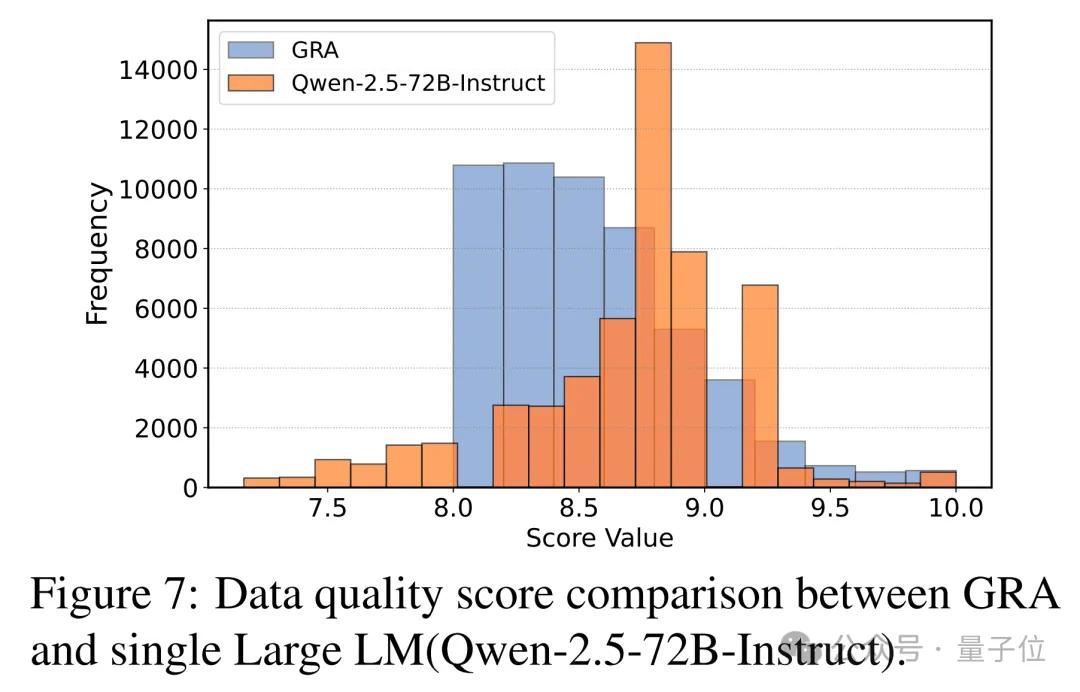 GRA生成的数据不仅通过多个小模型评审,还在对比实验中获得了来自Qwen-2.5-72B的高分认可——其中超过87.3%的样本评分高度一致。