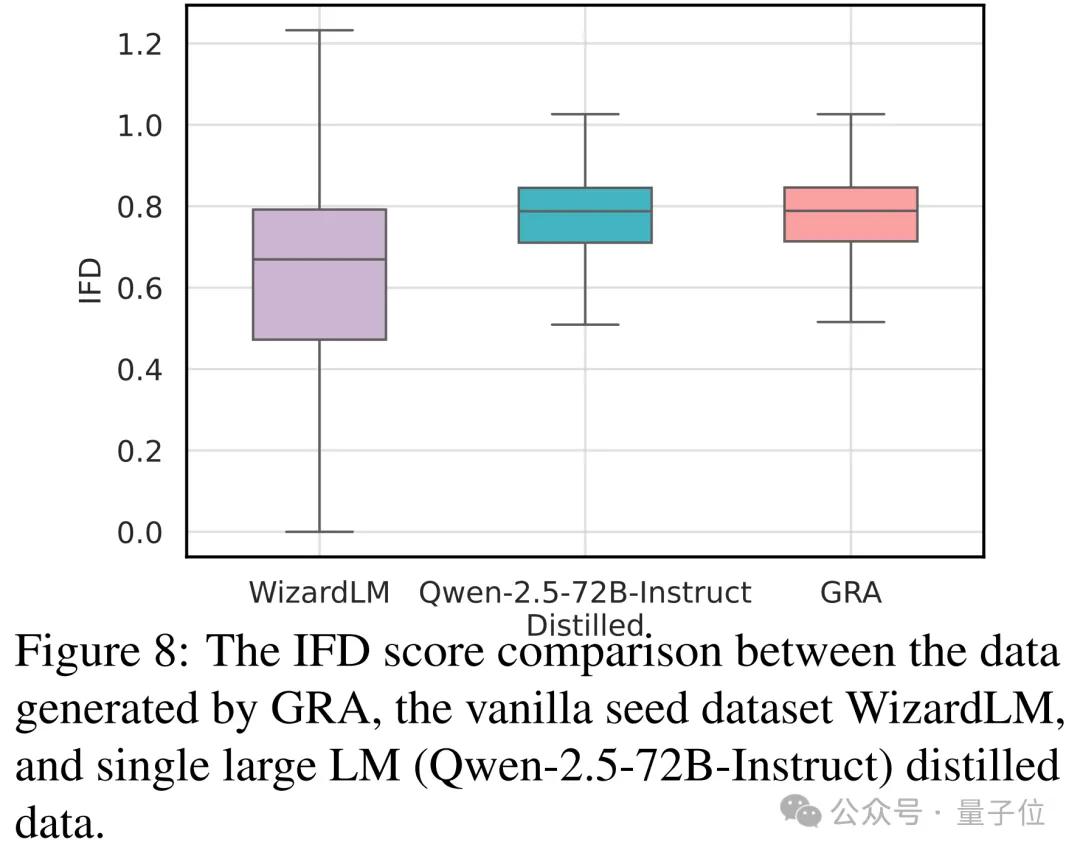 通过Instruction-Following Difficulty(IFD)指标分析,GRA生成数据的任务难度比种子数据高出14.58%,并且与大模型蒸馏数据基本持平(GRA:75.82%,Qwen-72B蒸馏:75.49%)。这意味着GRA能够构建具挑战性、高知识密度的数据,为小模型提供更具张力的训练样本。