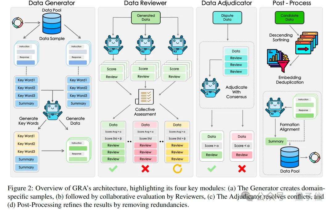 如果说传统方法是单枪匹马生成数据,那GRA更像是一次“模拟顶会审稿流程”——作者、审稿人、AC各就各位,小模型分工合作、打分评审,确保数据内容质量稳定、标准统一。