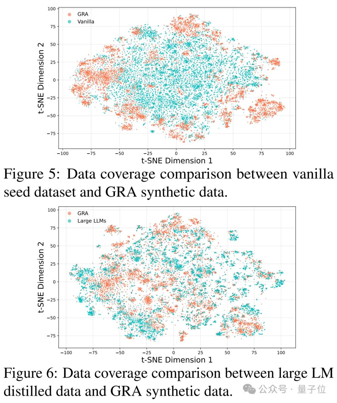 通过t-SNE可视化对比发现,GRA生成的数据分布明显比原始种子数据和大模型蒸馏数据更广、更均匀,尤其在原始数据未覆盖的语义空间中表现出良好的补充能力。这表明GRA所产数据具备更强的覆盖面和多样性。