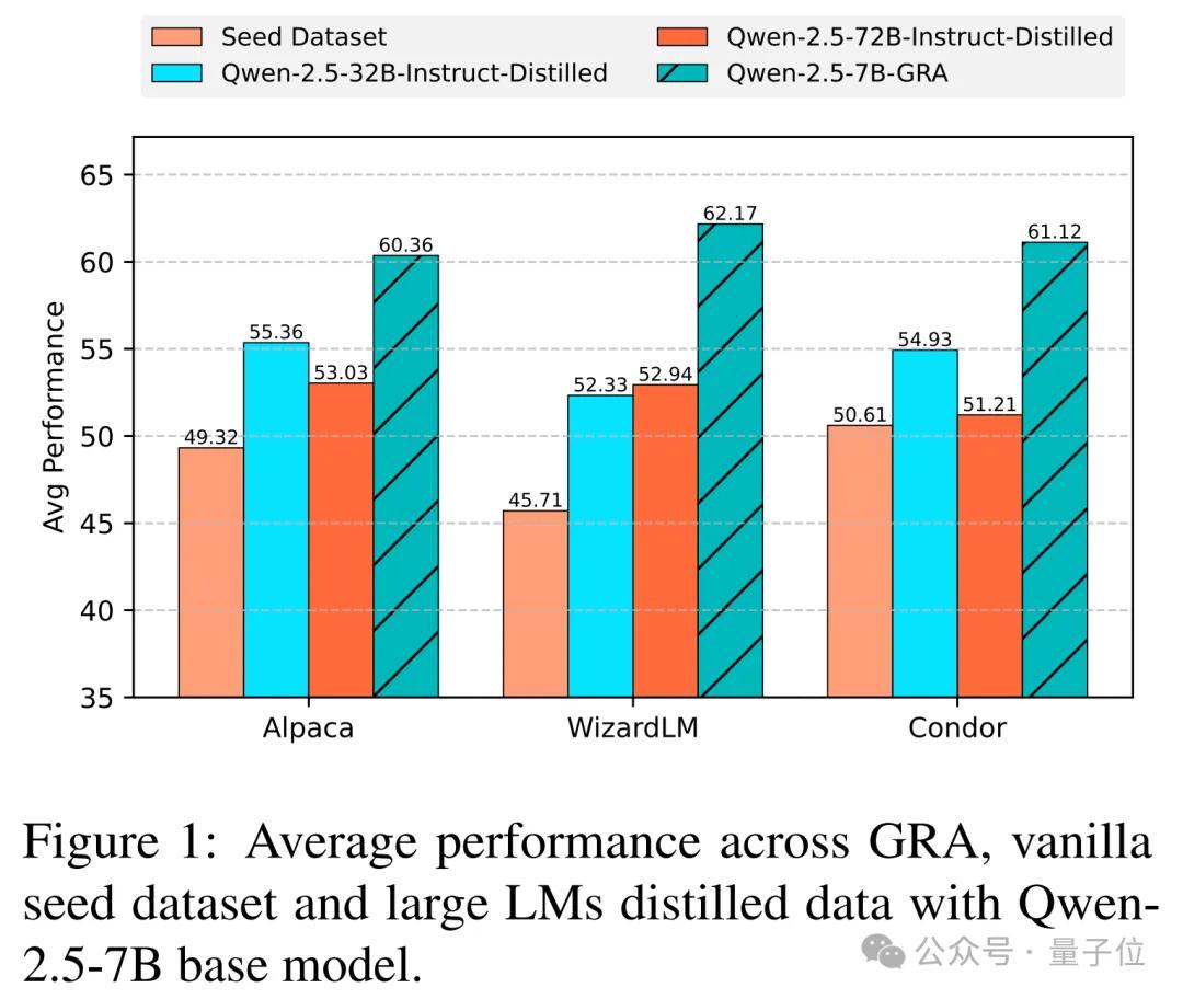 2.能和大模型蒸馏正面硬刚:GRA在LLaMA-3.1生成数据训练的模型性能,仅比Qwen-72B蒸馏版低0.59%;在Qwen-2.5生成数据训练的模型性能,平均领先Qwen-72B蒸馏版达8.83%。表明小模型协同机制有望成为更低成本、更高性价比的大模型替代方案。