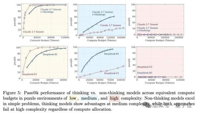 当问题复杂度继续增加并超过某个临界点时,无论是推理模型还是标准模型都会经历完全的性能崩溃,准确率直线下降至零,甚至会减少思考token。
