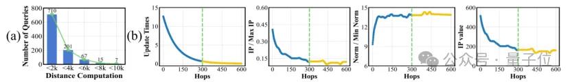 如上图,PSP研究团队发现,在图索引上搜索到精确解的“最少步数”因Query而异,呈现明显的长尾分布(图a),而他们也通过大量实验挖掘出四类“特征”帮助我们判断搜索应该在什么时候停下来(图b)。这四类特征可以在搜索过程中以非常低的成本被计算和记录,实现自适应的“早停”策略。