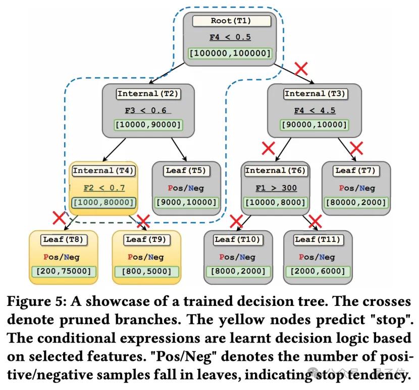 具体来说,可以在数据库中随机采样一部分点作为query,通过对它们进行搜索来收集最优停止步数前后的数据构成可分类的样本,再用这个样本去训练一颗决策树,就可以辅助搜索过程判断停止条件: