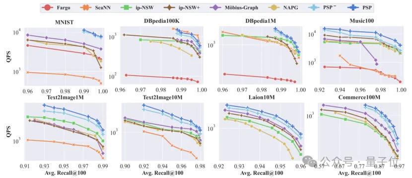 研究团队为了充分测试PSP算法的效果,在8个大规模、高维度的数据集上进行了充分测试。从维度看,DBpedia100K和DBpedia1M分别高达1536和3072维,用OpenAI text-embedding-3-large模型抽取;从数量看,最大的数据集Commerce100M包含1亿数据库点。