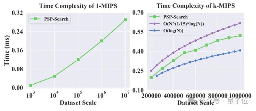 上图可以看出,PSP在Top-1近邻上表现出log(N)速率增长的时间复杂度。而在Top-K检索上表现出接近log(N)的复杂度。这体现出PSP优秀的可扩展性,即在十亿乃至百亿级别的数据上进行高效检索的潜力。