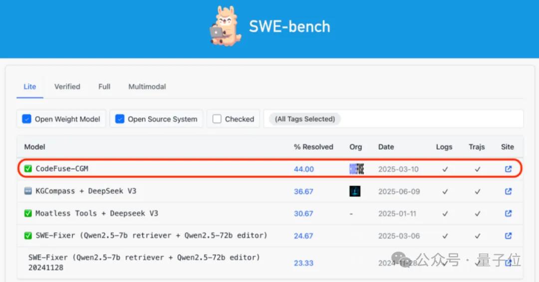 在SWE-bench Lite Leaderboard上,CGM以44.00%的结果排名开源权重榜单第一。