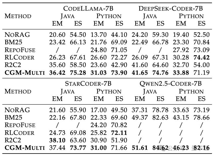 此外,研究团队在不同基座模型上(CodeLlama-7B和DeepSeek-Coder-7B)分别部署了CGM,并与近期RAG系统进行比较。结果显示,CGM具备很好通用性,可以适配多种基座模型,并且表现超越传统RAG方法。