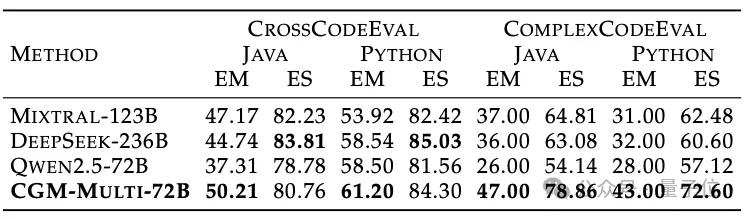 在复杂代码生成任务中,CGM在ComplexCodeEval和CrossCodeEval上也显著领先于同尺寸开源模型,特别是在需要跨文件推理和补全的场景下效果突出。
