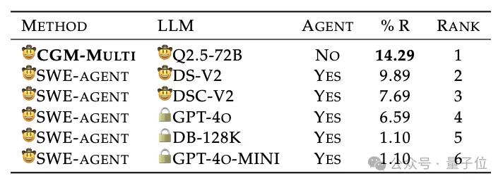 而且,CGM完全基于开源模型。要知道,开源模型在SWE-bench上的表现通常不够好,此前几乎所有SOTA级方案都是基于闭源模型实现。而CGM基于Qwen模型,做到了比肩闭源模型的水平。