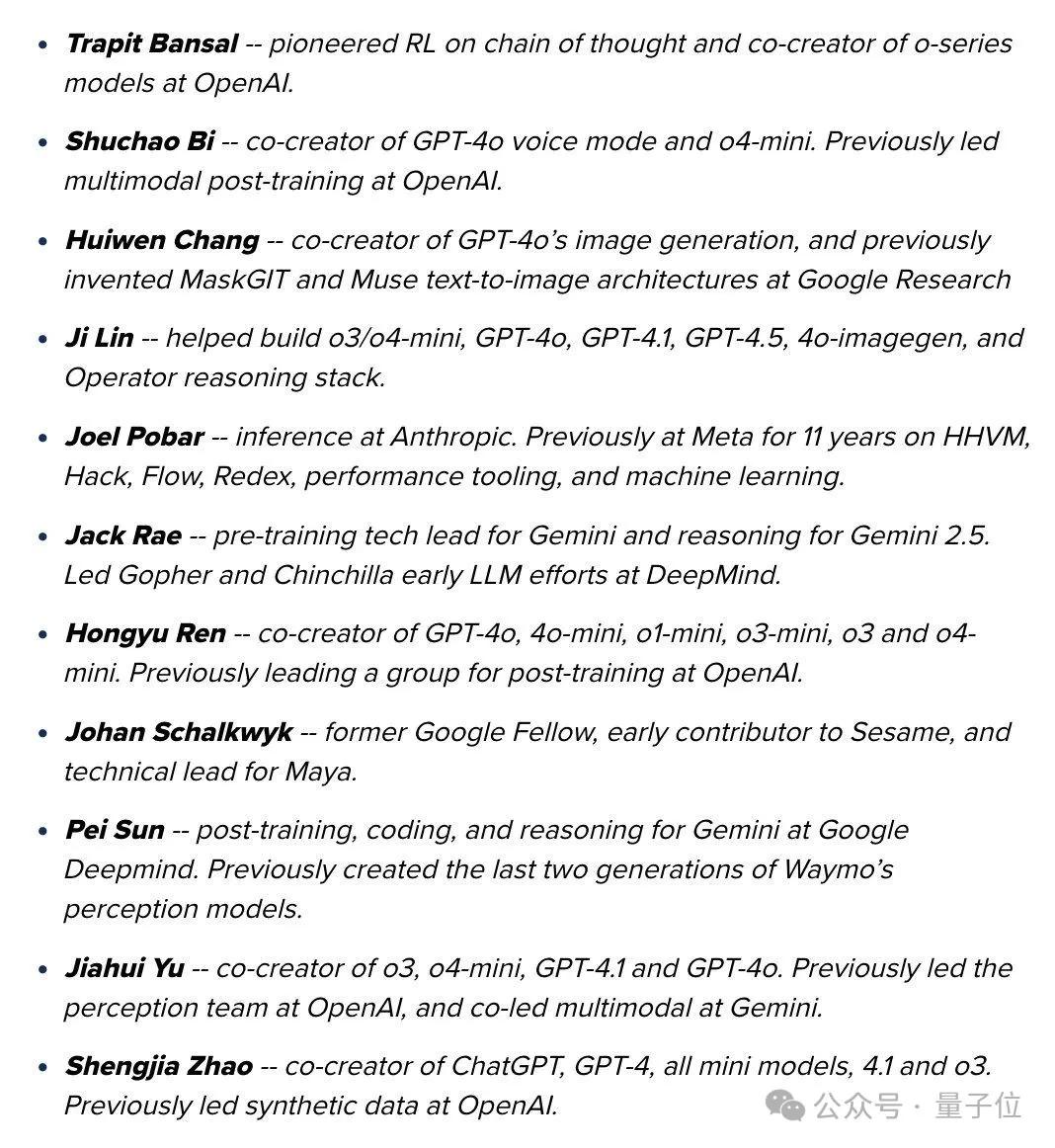 - 于佳慧(中科大校友):o3、o4-mini、GPT-4.1和GPT-4o的共同创造者,此前在OpenAI领导感知团队,在Gemini中共同领导多模态工作。