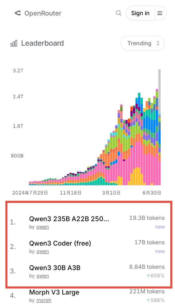 Qwen3-Coder的开源,引爆硅谷科技圈,在全球AI圈掀起一波「AI编程」热潮。推特创始人杰克·多尔西(Jack Dorsey)、爆火Agent应用Perplexity CEO 阿拉温德·斯里尼瓦斯(Aravind Srinivas)、著名风投公司a16z合伙人马克·马斯克罗(Marco Mascorro)等硅谷大咖盛赞Qwen3-Coder,HuggingFace CEO 克莱门特·德朗格(Clement Delangue)更是连转带发12条推文,向全球开发者力荐这一最好的编程模型。海外知名模型API聚合平台OpenRouter数据显示,阿里千问API调用量暴涨,过去几天已突破1000亿Tokens,在OpenRouter趋势榜上包揽全球前三,是当下最热门的模型。