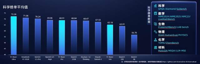 在科学能力方面,“磐石·科学基础大模型”已系统掌握数理化天地生六大学科核心定理、定律与专业知识,并实现了对波、谱、场等多种科学模态数据的深入理解。具体测评中,在基础学科领域国际通用的数据集里,达到数学、物理、化学、材料、生物各学科门类当前最佳性能;在通用人工智能助手测试基准(GAIA)、事实性问答数据集(SimpleQA)等国际权威测试中,展示了领先的科学专业工具调用和科学推理性能;在人类终极考试(HLE)中取得了优秀成绩。